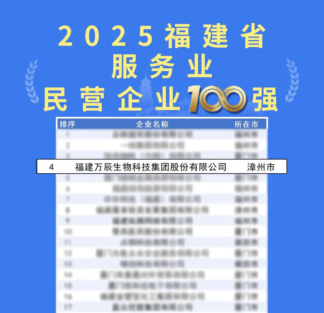 9月28日,2025福建省民營企業(yè)100強發(fā)布暨寧德市產(chǎn)業(yè)招商推介會在寧德舉行,會上福建省工商聯(lián)發(fā)布了2025福建省民營企業(yè)100強、制造業(yè)民營企業(yè)100強、服務(wù)業(yè)民營企業(yè)100強、創(chuàng)新型民營企業(yè)100強4個榜單。萬辰集團登榜,位列2025福建民營企業(yè)100強第16位、2025福建服務(wù)業(yè)民營企業(yè)100強第4位。